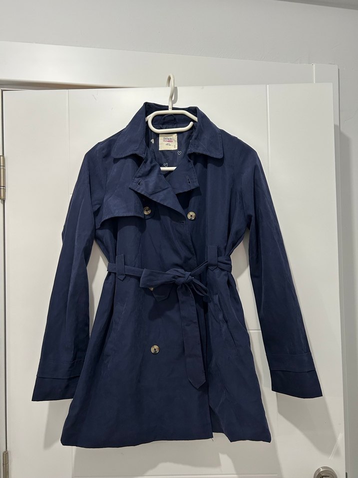 Bu lacivert midi trençkot, kemerli beli ve kesik yaka detayıyla sentetik kumaştan üretilmiştir. Normal kesim ve askılı kollarıyla şık ve rahat bir sokak stili sunar. +14 yaştır fakat xs ve s beden uyumludur
