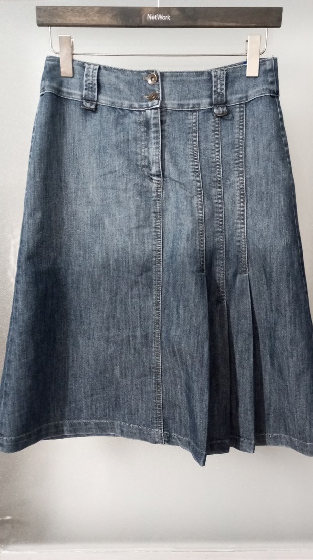 Kadınlar için lacivert kot etek, bol kesim ve pile detaylarıyla rahat bir sokak stili sunar. Midi boyda ve desensiz, günlük kullanıma uygundur.