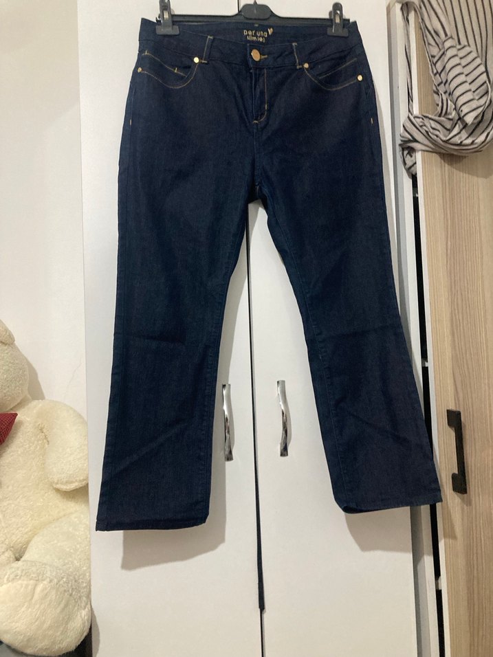Lacivert kot kumaştan, normal boy midi kesim, kemerli ve rahat kalıplı kadın pantolonu. Günlük sokak stiline uygun. M&s per una slim leg