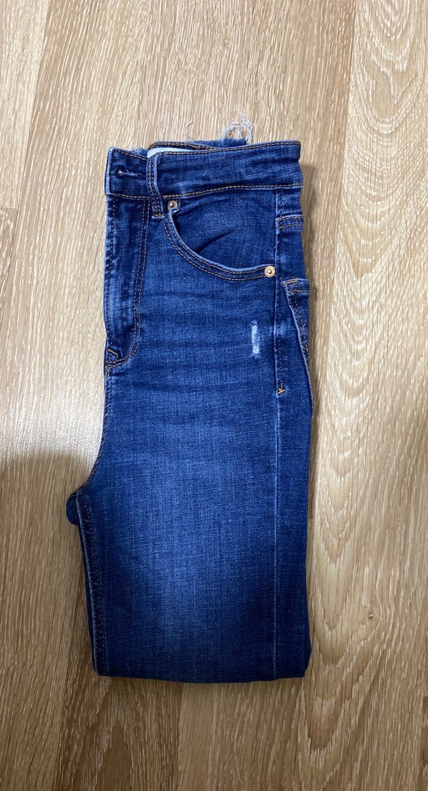 Lacivert kot pantolon, regular fit ve midi boyda. Tokalı detay ve parlak yüzeye sahip, günlük rahat sokak stili için uygun. Desensiz tasarım.