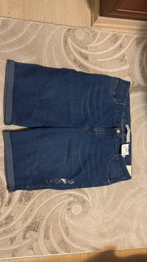 Lacivert kot şort, bol kesim ve kemerli bel ile. Midi boy, günlük kullanıma uygun rahat sokak stili. hiç kullanılmadı üründe iade yoktur