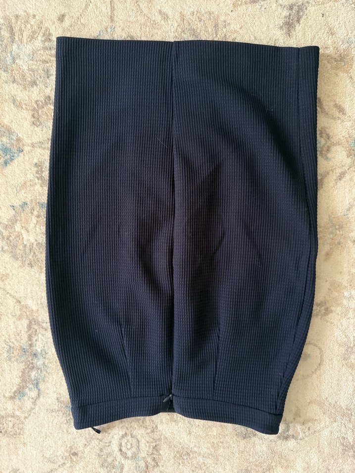 Kadınlar için lacivert renkte, sentetik kumaştan, fermuarlı ve normal boy midi kumaş pantolon. Ofis kullanımı için uygun, minimal ve şık tarzda.