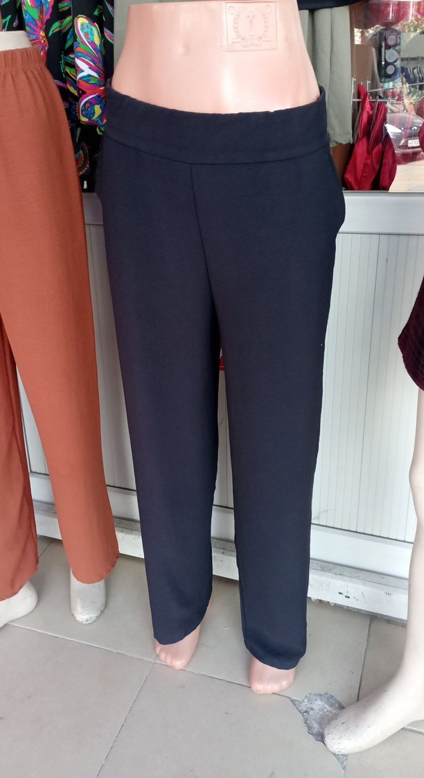 Kadınlar için koyu mavi midi uzunlukta, regular fit kumaş pantolon. Düz desenli, sentetik kumaştan, ofis ortamına uygun, zahmetsiz şıklık sunar.