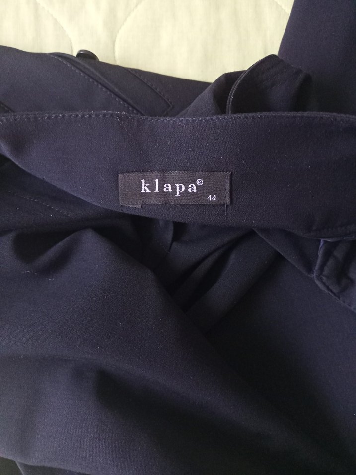 lacivert midi uzunlukta, regular fit ve fermuarlı detaylara sahip kadın pantolon. İpeksi kumaştan üretilmiş, ofis ve sokak stili için uygun. Marka etiketi 'klapa'.
