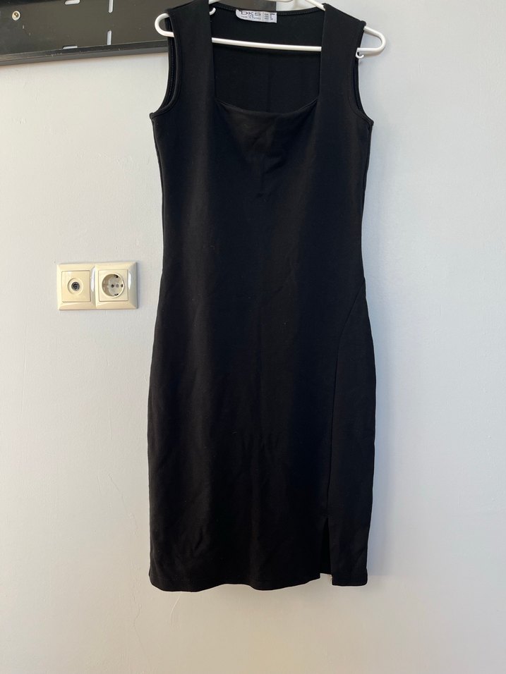 Siyah renkte, normal boyda midi mezuniyet elbisesi. Drapeli, askılı kollu ve yakası kesimli. Rahat kesimiyle dış mekanlar için uygun.