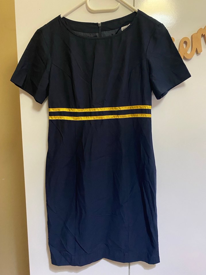 Lacivert midi elbise, kısa kollu, kayık yaka ve belinde sarı çizgili kemer detayına sahip 34/44 Xs/Xl bedene kadar mevcuttur.