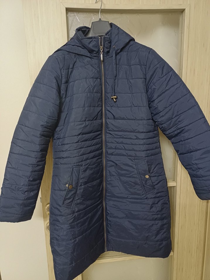 Kadın lacivert midi uzunlukta, çıtçıtlı cepli, kapüşonlu şişme mont. Normal kesim, parlak yüzeyli ve günlük rahat kullanıma uygun.