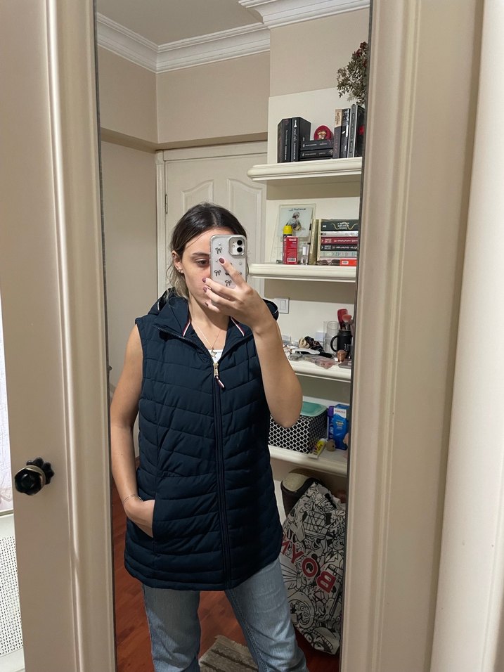 Southblue serisine ait, kadınlar için, yüksek yakalı ve kolsuz kesime sahip, normal boy midi şişme yelek. Günlük kullanıma uygun, rahat ve şık bir tasarım. Hiç kullanılmadı, sağlam, defosuz.