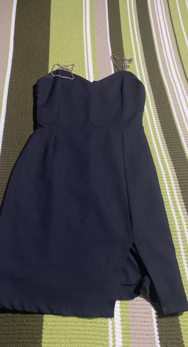 Lacivert, straplez ve ince askılı bu dar kesim midi elbise, tokalı detaylara sahiptir. Minimalist ve sokak stiliyle romantik akşamlar için uygundur.