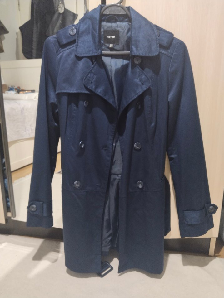 Lacivert midi uzunlukta, düğmeli, uzun kollu, regular fit trençkot. Ofis ve günlük sokak stili için uygundur.