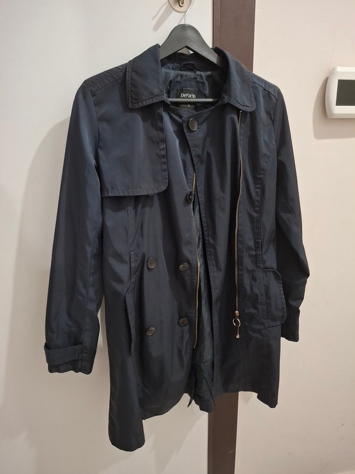 Kadınlar için lacivert midi trençkot, kesik yaka ve düğmeli ön detaylara sahiptir. Uzun kollu, bol kesim ve denim kumaştan üretilmiştir, günlük ve sokak modası için uygundur.
