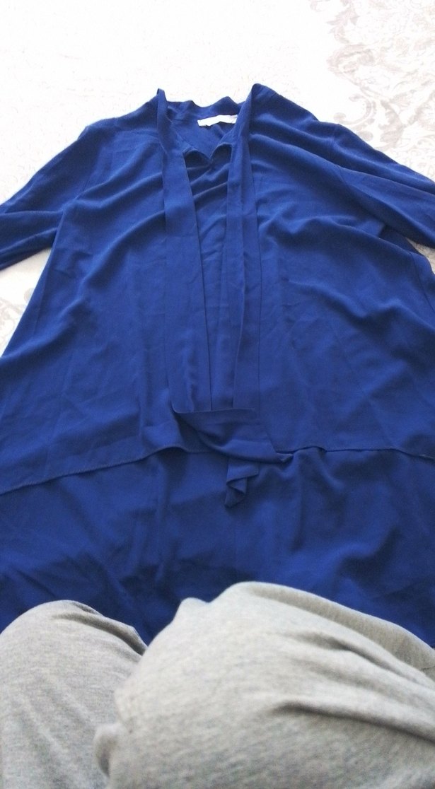 Kadınlar için uzun kollu, midi boy, lacivert renkli, salaş kesim ve desensiz tunik günlük kullanım için uygundur.