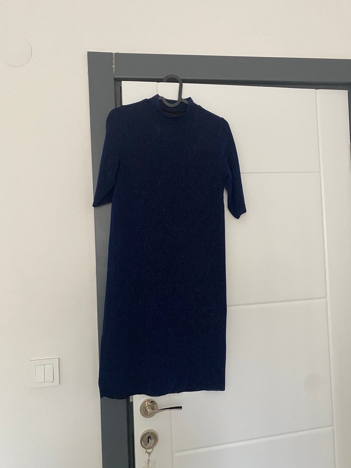 Lacivert midi boy, yüksek yakalı ve kısa kollu, vücuda oturan elbise. Pürüzsüz sentetik kumaştan, günlük kullanıma uygun şık ve sade tasarım.Etiketi koparılmış koparılan yerde küçük bir deforme olmuştur.