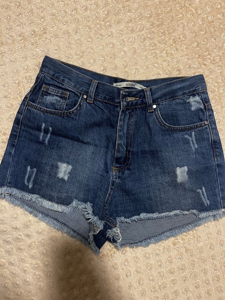 Lacivert renkli, bol kesim, kısa paçalı, hafif yıpranmış ve püsküllü kenarlı denim şort, gündelik sokak stiline uygun.