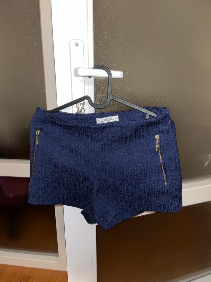 Fermuarlı cepleri ve şık koyu lacivert tasarımıyla, günlük sokak stiline uygun, dar kesim mini denim şortlar.