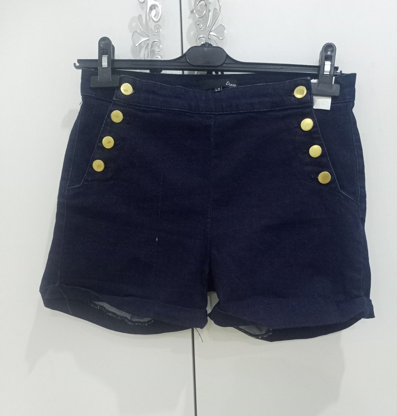 Lacivert mini denim şort, ön kısmında düğme detaylarıyla trend sokak stilini yansıtır. Günlük kullanıma uygun, şık ve rahat bir parçadır.