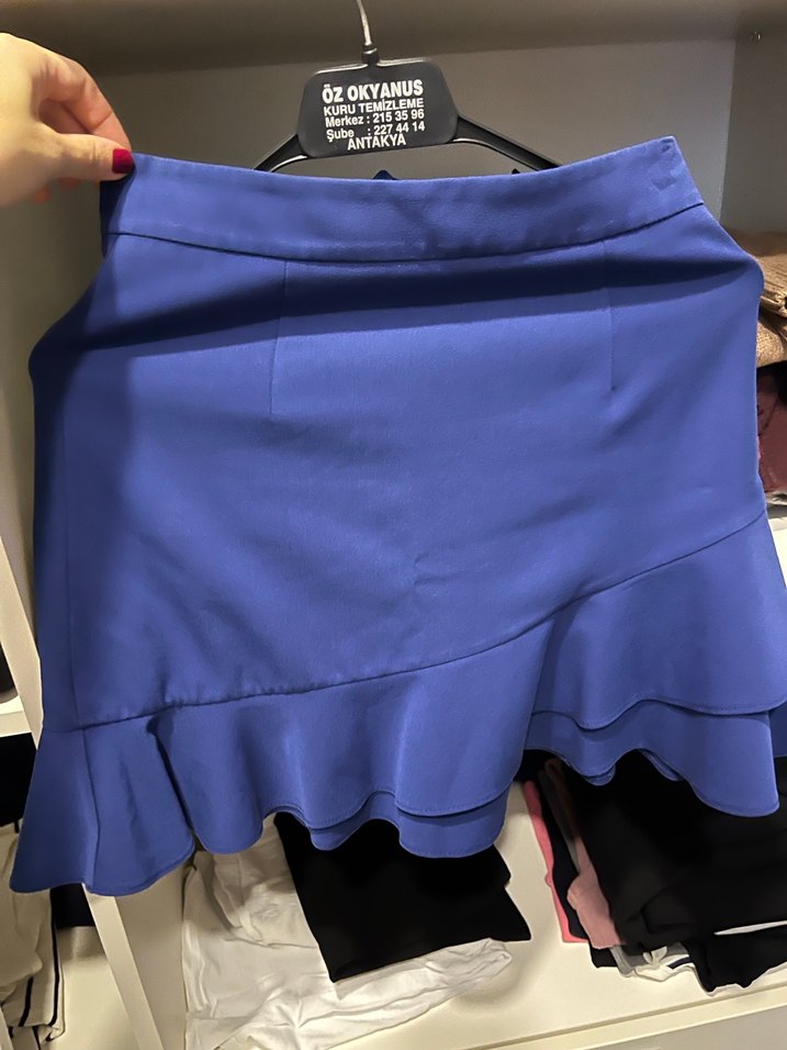 Lacivert, sentetik kumaştan, fırfırlı etek ucu detaylı, dar kesim mini etek. Paris tarzı günlük sokak modasına uygun.