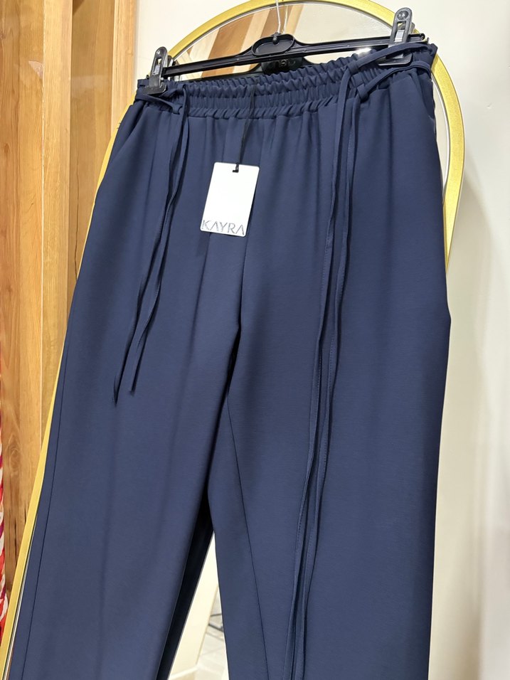 Kadınlar için lacivert pantolon beli lastikli ve bağcıklı 44-46 bedenleri mevcut