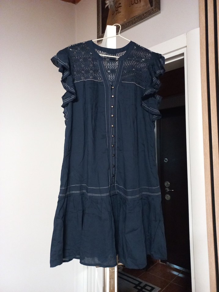 Lacivert renkli, nakış işlemeli ve fırfırlı, salaş kesim bohem tarzda, kot kumaştan yapılmış kolsuz midi elbise. V yaka ve günlük kullanım için uygundur.