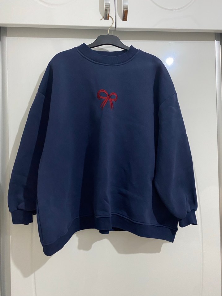 Kadınlar için yuvarlak yakalı, uzun kollu, rahat kesim sweatshirt. Yumuşak fleece kumaş, lacivert renk ve önünde nakışlı fiyonk detayı bulunur. Rahat ve şık sokak stili için uygundur.