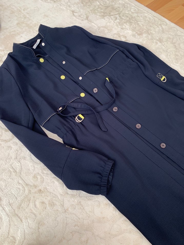 Lacivert uzun düğmeli kaban, yakalı ve nakış detaylı. Yumuşak ve sıcak kumaştan, uzun kollu ve rahat kesim, günlük sokak stili için uygun.