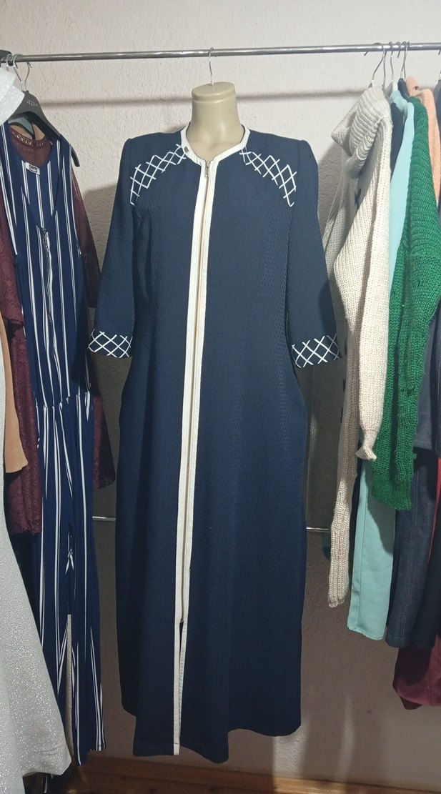 Kadınlar için lacivert sentetik kumaştan, nakış detaylı, çıtçıtlı uzun elbise. Notlu yaka ve çıtçıtlı ön detayına sahip, klasik ve sade tarzda.