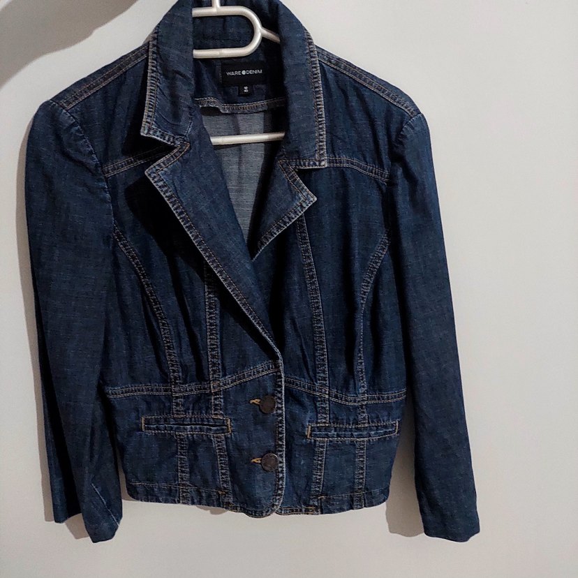 Kadın lacivert denim ceketin önünde yaka detaylı ve düğmeli kapama bulunur. Uzun kollu, normal boy ve rahat kesimdir, günlük sokak stili için uygundur.