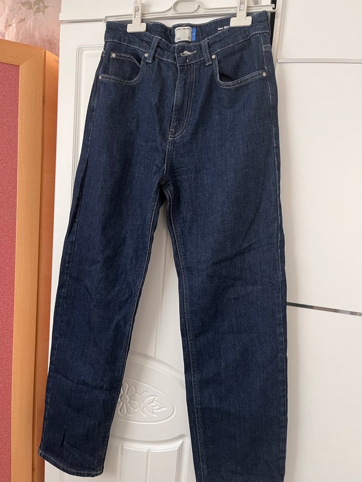 Kadın lacivert renkli, normal boyda denim jean. Rahat kesimi ve sade tasarımıyla günlük kullanıma uygundur. Sadece 1 kere kullanıldı