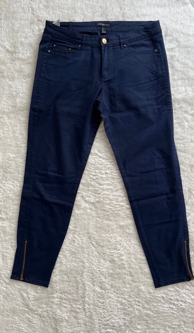 Kadınlar için normal boy midi uzunlukta, lacivert kumaştan yapılmış, fermuarlı detaylı rahat kesim pantolon. Günlük sokak stili için uygundur.