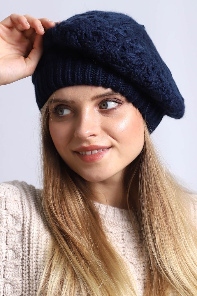 Kadınlar için koyu lacivert renkte, örgü dokulu ve bohem tarzda bere. Yumuşak triko kumaştan, rahat ve şık bir görünüm sunar.