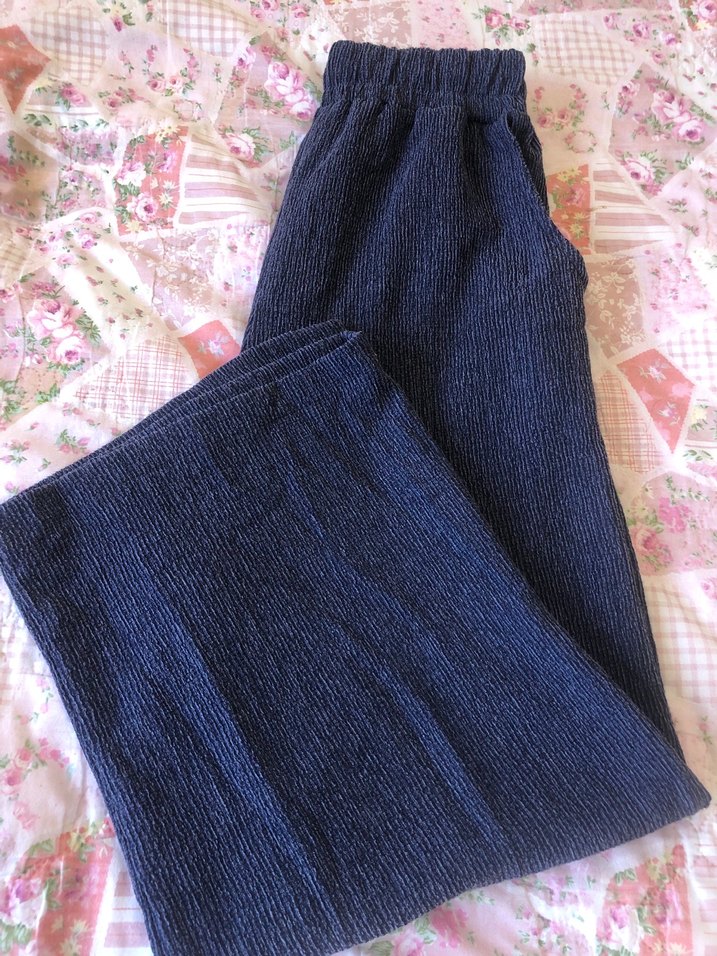 Kadınlar için lacivert renkli, örgü dokulu, bol kesim denim pantolon. Normal midi boyda ve lastikli bel yapısına sahip, rahat ve bohem tarzda günlük kullanım için uygun.