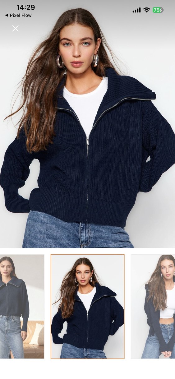Kadınlar için örgü, fermuarlı, yuvarlak yaka ve uzun kollu triko. Denim görünümlü kumaştan, normal boyda, günlük sokak stili için uygun lacivert renkte. Hiç giyilmedi