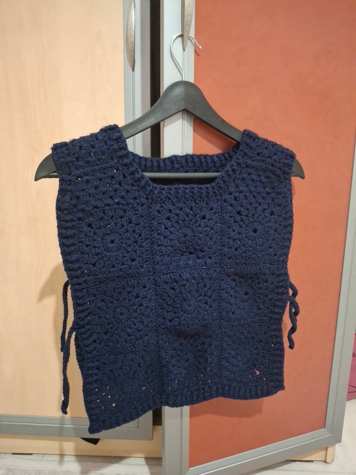 Kadınlar için kolsuz, gevşek kesim ve lacivert renkli örgü süveter. Yuvarlak yaka ve kısa boyuyla günlük kullanıma uygun rahat bir parça.