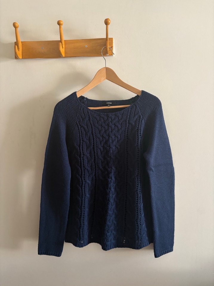 Lacivert renkli, örgü kumaştan yapılmış, yuvarlak yakalı ve uzun kollu bol kesim kadın kazak. Günlük rahat kullanıma uygundur. İki kol altı arası 45 cm