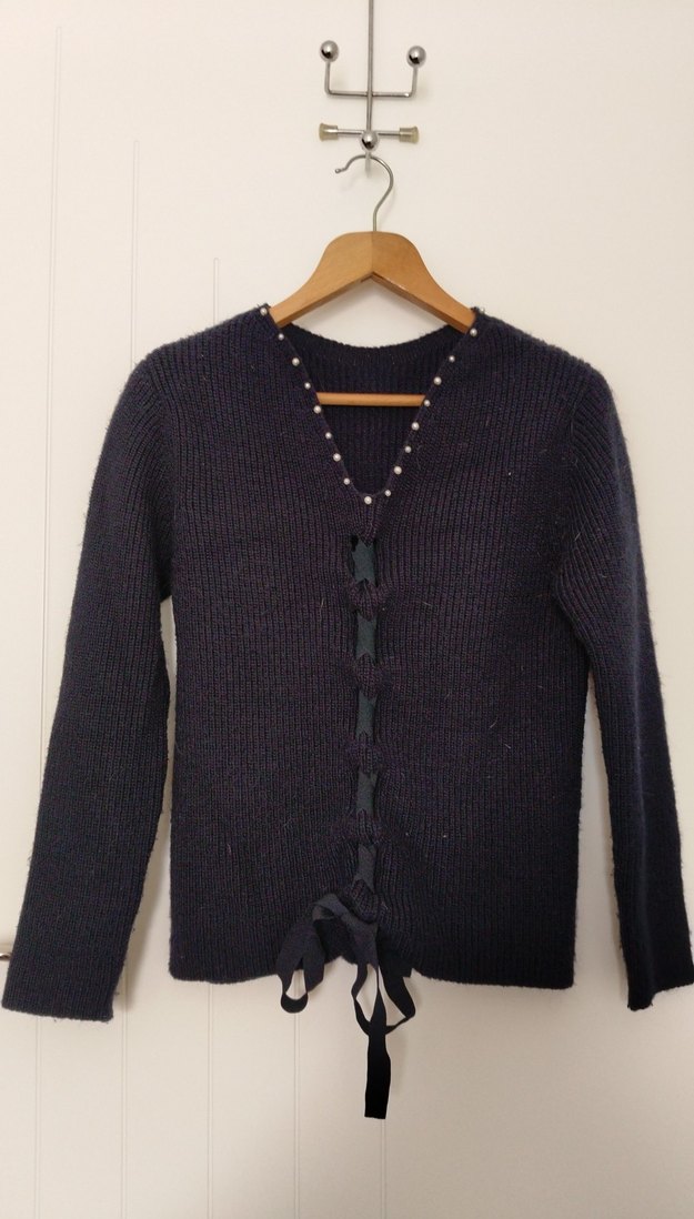 Lacivert ipekyol kazak, V yaka ve ön kısmında küçük boncuk detayları ile kurdele bağlamalı, rahat ve şık