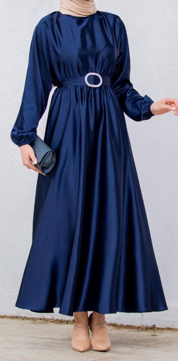 Kadınlar için bel detaylı, parlak lacivert, uzun kollu, salaş kesim, ipeksi kumaştan yapılmış uzun elbise. Hiçbir kusuru yoktur. Kemerinde toka bulunmamaktadır.