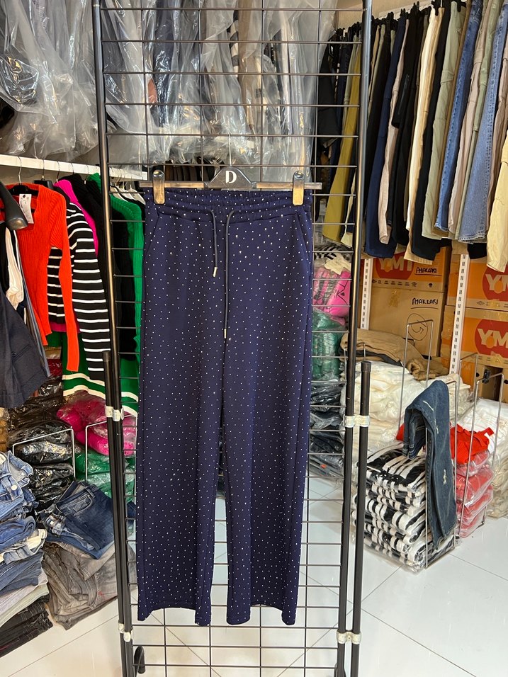 Bol kesim, uzun lacivert kumaş pantolon, payetli batik desenli, sentetik kumaştan, günlük kullanım için uygun sokak stili.