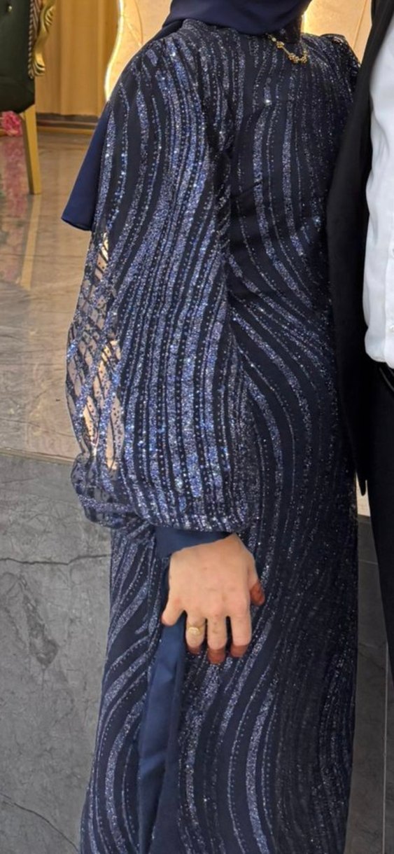 Lacivert payetli ve yılan desenli, uzun ve vücuda oturan abiye elbise. Uzun kollu ve yaka kısmı notch detaylı, mütevazı ve gösterişli tarzda, düğün için uygun.