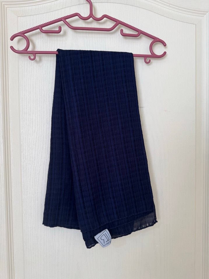 Keten kumaştan, pileli dokuda, lacivert renkte kadın şalı. Minimalist ve bohem tarzda, sade ve temel görünüme sahiptir.