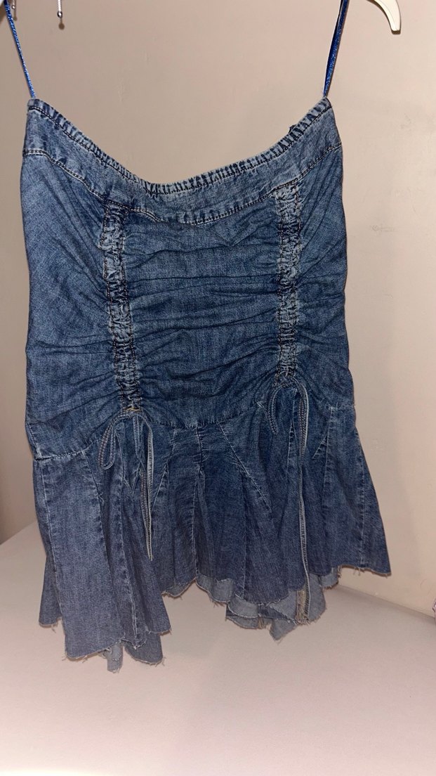 Kadın Lacivert Pileli Midi Denim straples Elbise
