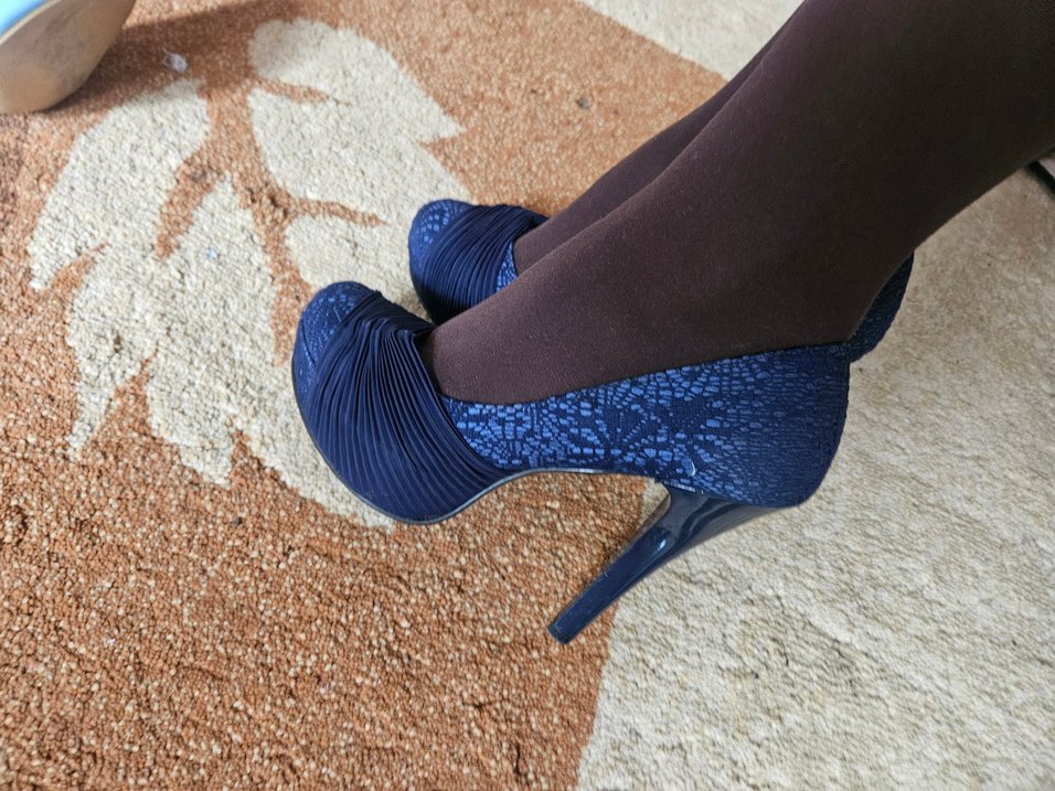 Kadınlar için koyu lacivert desenli, pileli detaylı ve kauçuk platform topuklu akşam ayakkabısı. Romantik gece için uygundur.