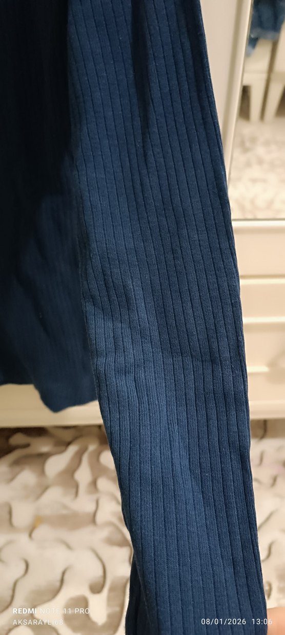 Kadınlar için pilili yapıya ve boğazlı yakaya sahip, ince kesim lacivert triko. Uzun kollu ve midi boyda, yumuşak sentetik kumaştan üretilmiştir.
