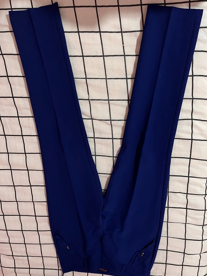 Kadınlar için lacivert, pilili ve midi boy kumaş pantolon. Normal kesim, iş ortamına uygun sade ve desensiz tasarım.