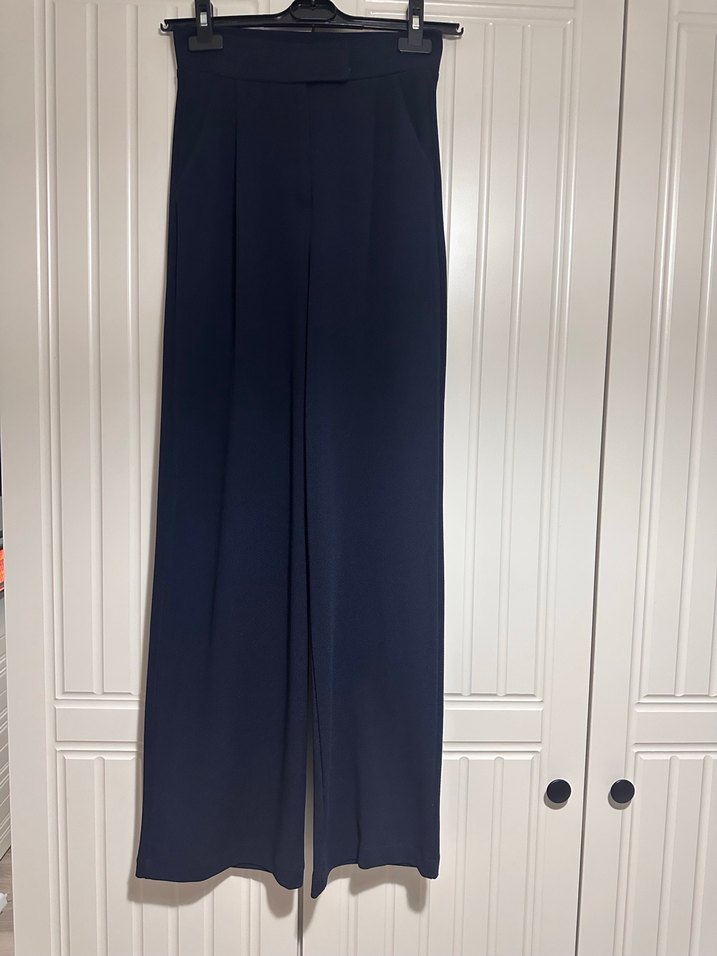 Kadınlar için lacivert renkte, uzun boy, pilili ve regular fit kumaş pantolon. Ofis için klasik ve şık bir tarz sunar, sentetik dokulu kumaştan üretilmiştir.