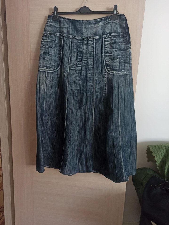 Lacivert midi boy pilili denim etek, bol kesim ve iki ön cep detayına sahiptir. Günlük kullanıma uygun bohem tarzda, normal uzunluktadır.