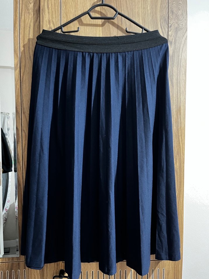 Lacivert pilili midi etek, sentetik kumaştan ve bol kesimlidir. Paris tarzı normcore stilinde günlük kullanıma uygundur.