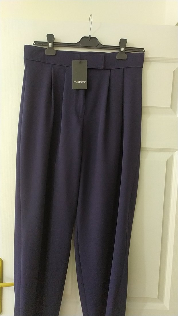 Kadın lacivert renkte, pilili midi uzunlukta, regular fit kumaş pantolon. Ofis kullanımına uygun, parlak ve yumuşak dokulu, desensiz model. marka temsilidir