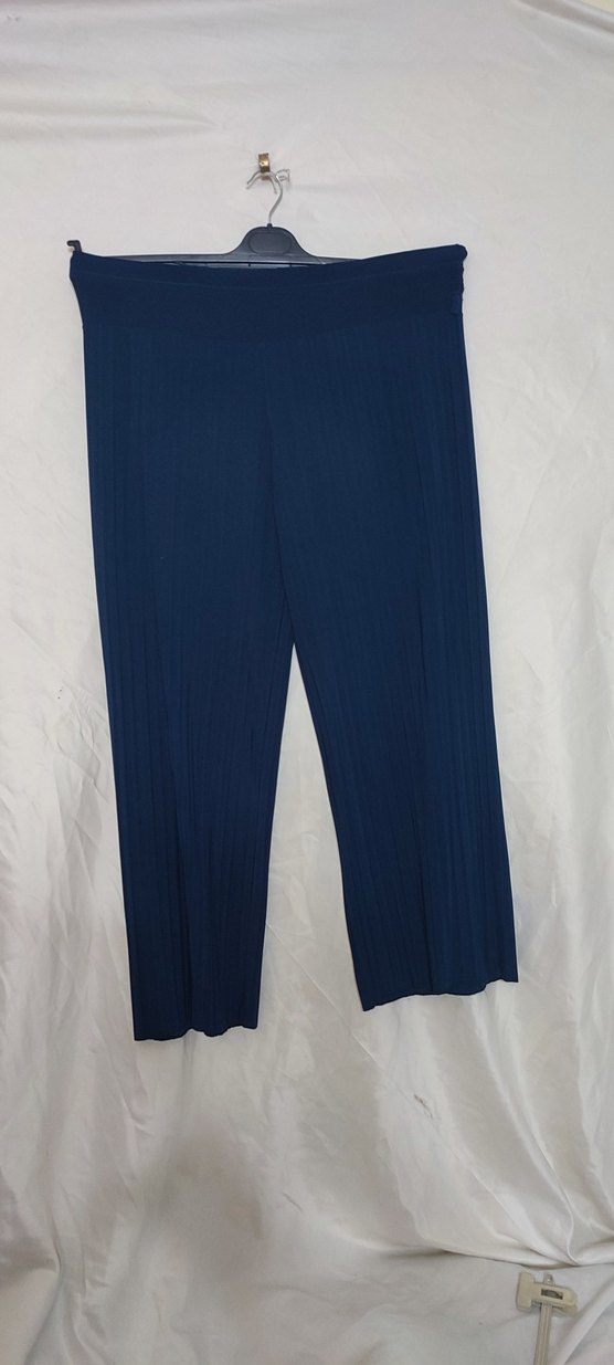 Kadınlar için regular fit, midi boy, lacivert pilili kumaş pantolon. Ofis ve sokak stili için uygun, yumuşak sentetik kumaştan üretilmiştir.