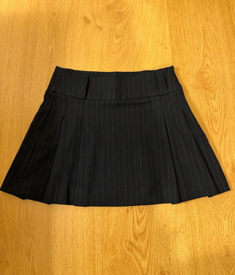 Lacivert renkli, pilili ve çizgili desene sahip, sentetik kumaştan üretilmiş, iş ortamına uygun, dar kesim mini etek.
