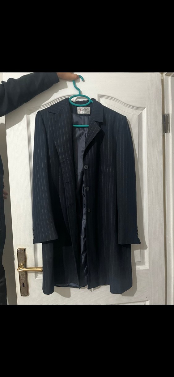 Lacivert, uzun kesim kadın ceket, pilili detaylara ve kırlangıç yaka sahiptir. Uzun kollu ve regular fit olup ofis kullanımı için uygundur.